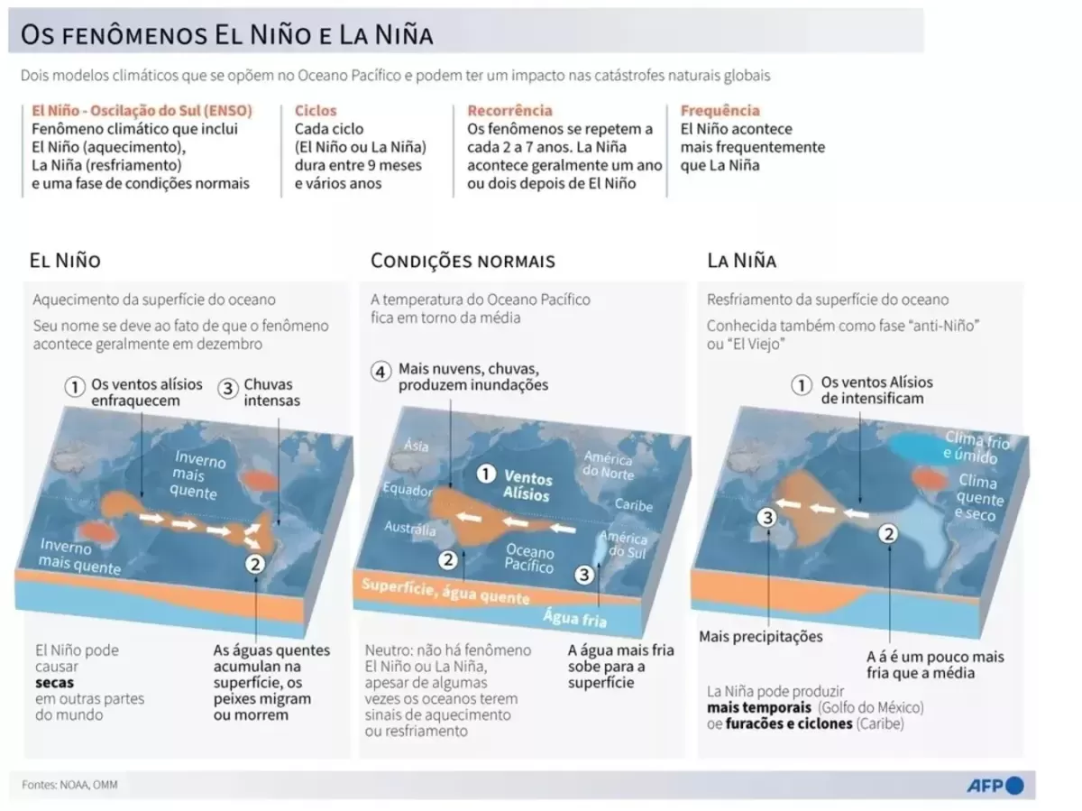 Um evento de El Niño ocorre quando as águas da superfície do Pacífico Equatorial se tornam mais quente do que a média e os ventos de Leste sopram mais fracos do que o normal na região. A condição oposta é chamada de La Niña. Durante esta fase, a água está mais fria que o normal e os ventos de Leste são mais fortes. Os episódios de El Niño, normalmente, ocorrem de cada três a cinco anos.