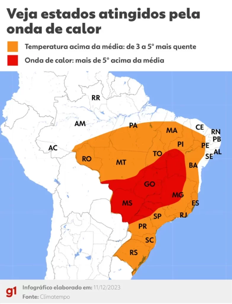 No restante do país, a previsão é de calor dentro da média. Faltam pouco mais de dez dias para o Verão, que começa em 22 de dezembro. Com isso, a Terra fica mais exposta ao Sol e com uma temporada de poucas chuvas há menos nuvens para impedir a passagem de tanto calor.