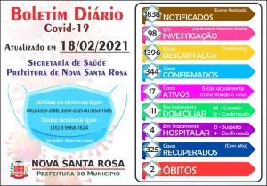 Os dados do Covid-19 para Nova Santa Rosa desta quinta-feira (18) apontam para 1.838 casos notificados e testados, destes, 344 casos deram resultado positivo, sendo que 325 já estão recuperados e 17 casos continuam ativos e transmitindo o vírus atualmente.