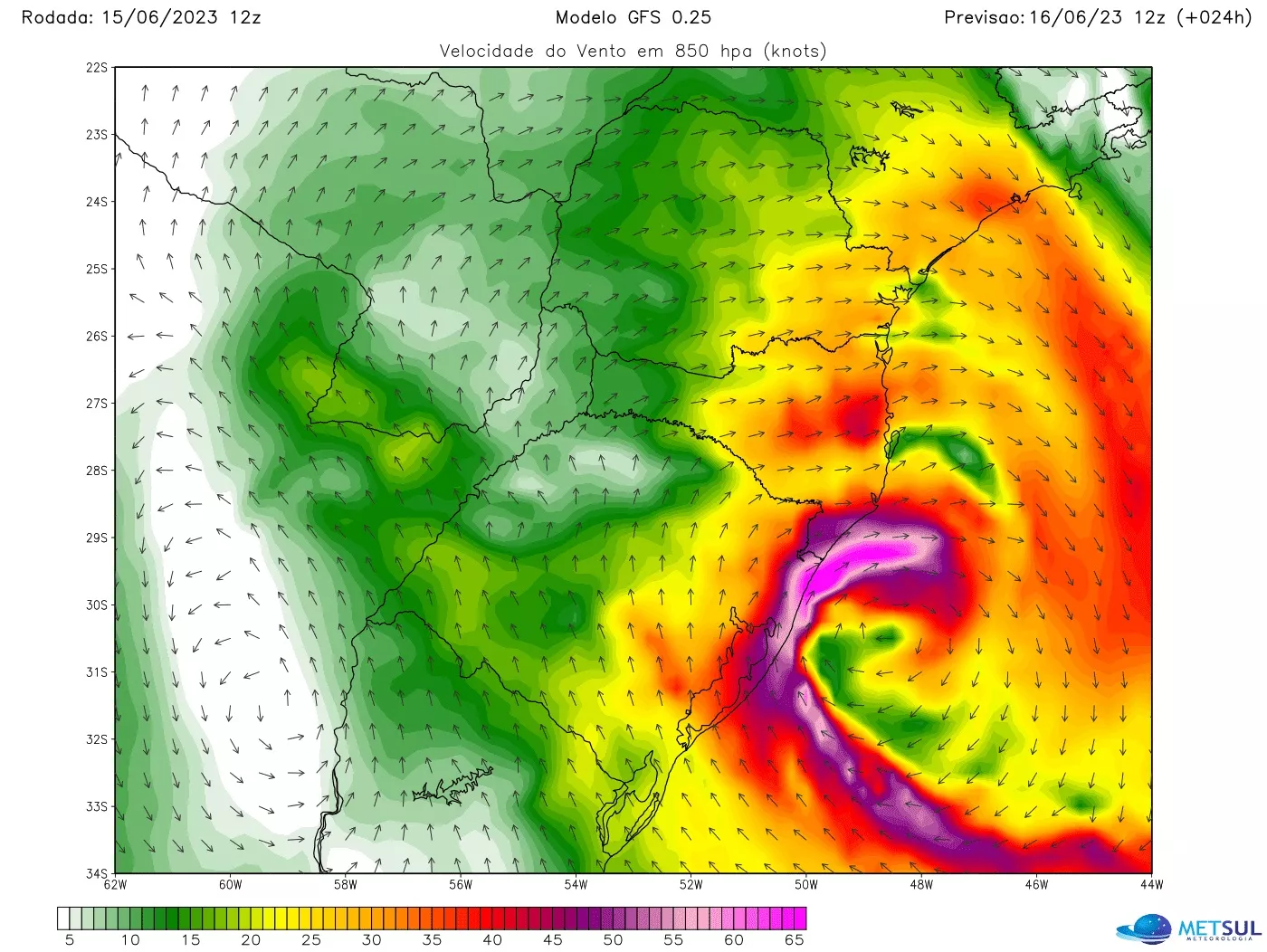 No Paraná, muitas cidades sequer terão chuva. Por sua vez, o vento também não se desenha como de alto risco. Onde mais deve ventar deve ser no Litoral Sul com rajadas mais fortes, em média, de 50 km/h a 70 km/h. Embora o tempo fique mais ventoso no final da quarta e na primeira metade da quinta em Porto Alegre e no Litoral Norte, as rajadas não devem ser intensas e o vento ficará em média entre 40 km/h e 60 km/h na maioria dos locais com rajadas pouco superiores na Lagoa dos Patos e na beira da praia. Mesmo sem previsão de vento muito intenso, há alguma preocupação com o Sul gaúcho. Por conta da rede elétrica que foi muito danificada e fragilizada pelo ciclone com vento de até 150 km/h de duas semanas atrás.