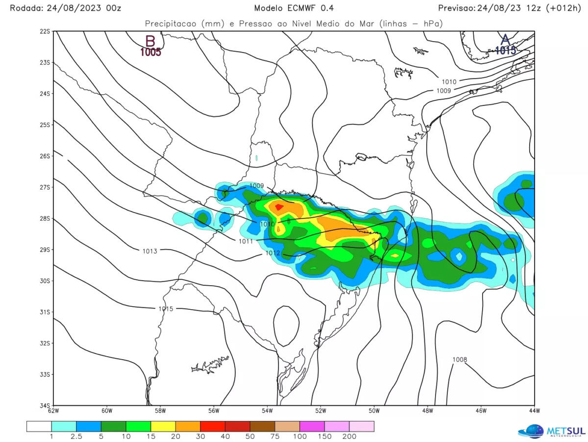 Os mapas a seguir mostram a projeção de evolução da precipitação, e por consequência, do risco de temporais isolados de vento e granizo associados, para esta quinta-feira no Sul do Brasil a partir de dados do modelo meteorológico europeu.