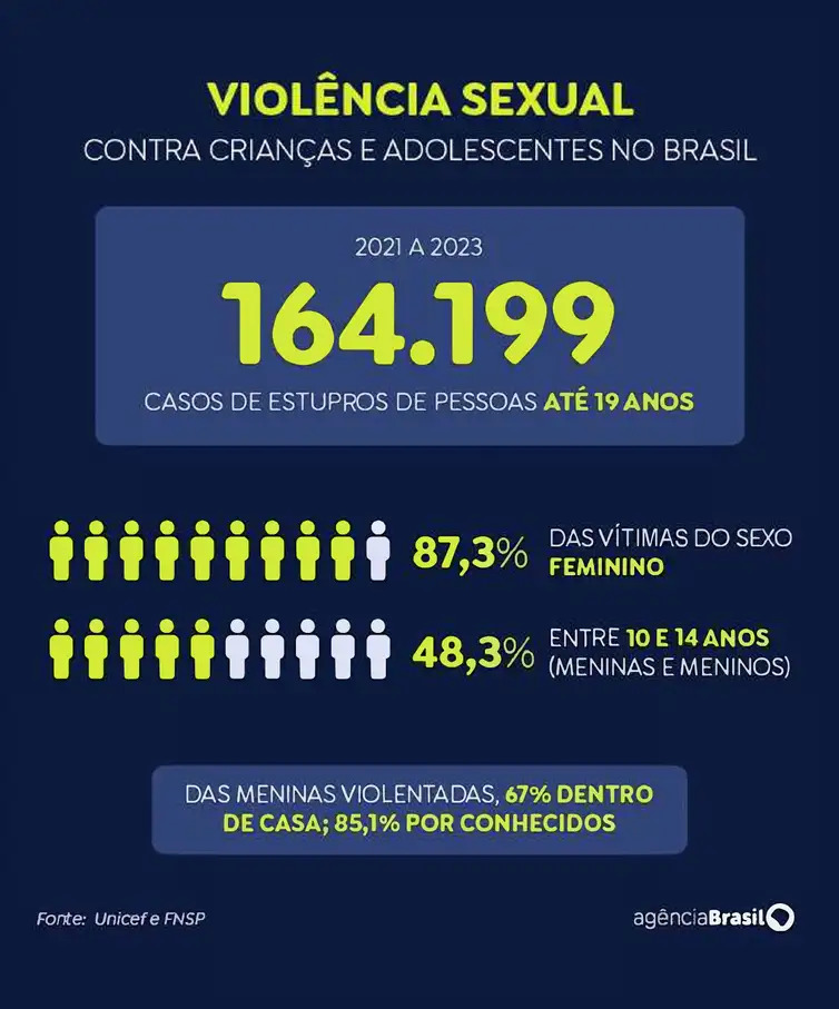 No período de 2021 a 2023, o Brasil teve 164.199 casos de violência sexual contra crianças e adolescentes até 19 anos. A constatação faz parte da segunda edição do relatório Panorama da Violência Letal e Sexual contra Crianças e Adolescentes no Brasil. O estudo foi divulgado nesta terça-feira (13) pelo Fundo das Nações Unidas para a Infância (Unicef) e pelo Fórum Brasileiro de Segurança Pública (FBSP), uma organização não governamental formada por profissionais da área de segurança, acadêmicos e representantes da sociedade civil.