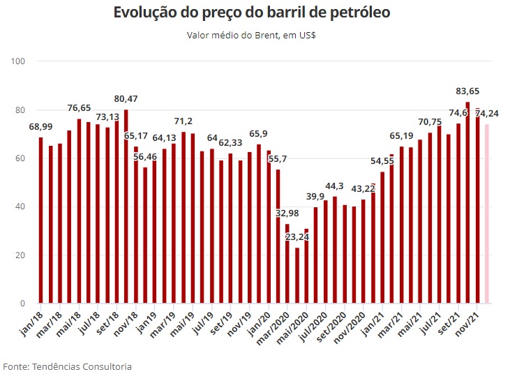 Na tarde desta terça-feira (11), o Brent era negociado em alta, acima de US$ 83, contra um preço médio de US$ 74,24 em dezembro. Já o dólar é negociado em queda, abaixo de R$ 5,60. Veja a cotação.