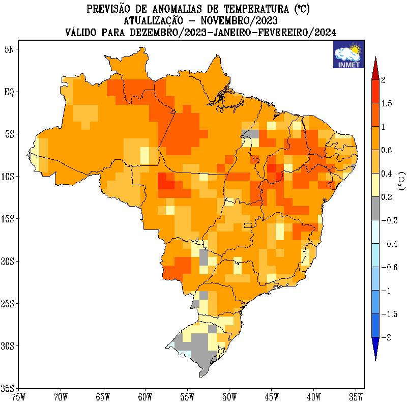 O Inmet prevê temperaturas elevadas para quase todo o Brasil no verão, que vai de dezembro de 2023 a março de 2024.