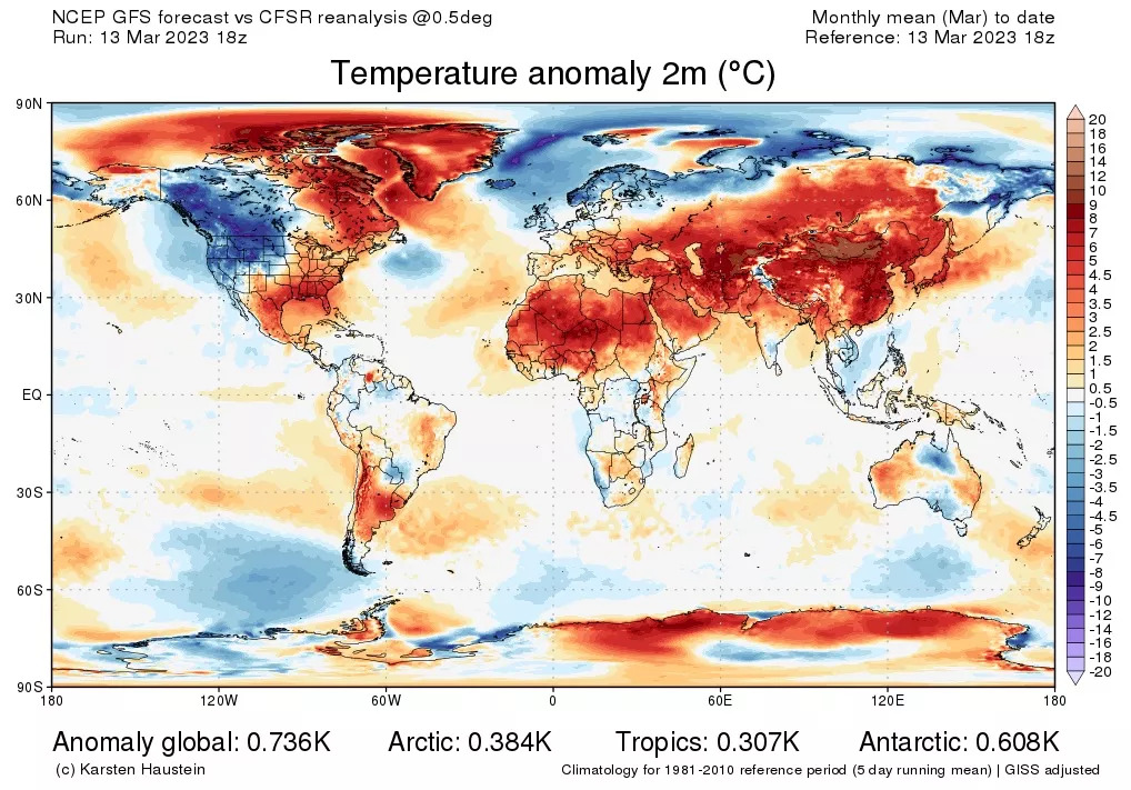 Olhando para o planeta inteiro, entretanto, não apenas se observa muitas áreas em que as temperaturas estão acima da média como em enormes regiões do globo a temperatura está muitíssimo acima do normal com ondas de calor em pleno inverno astronômico em países do Hemisfério Norte.