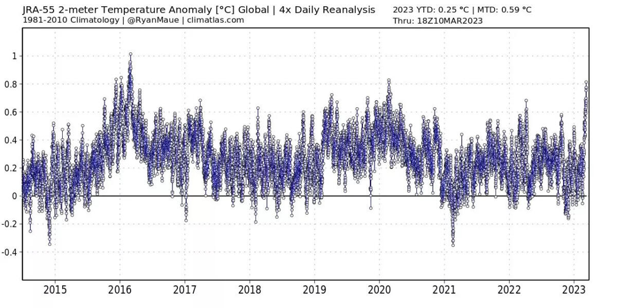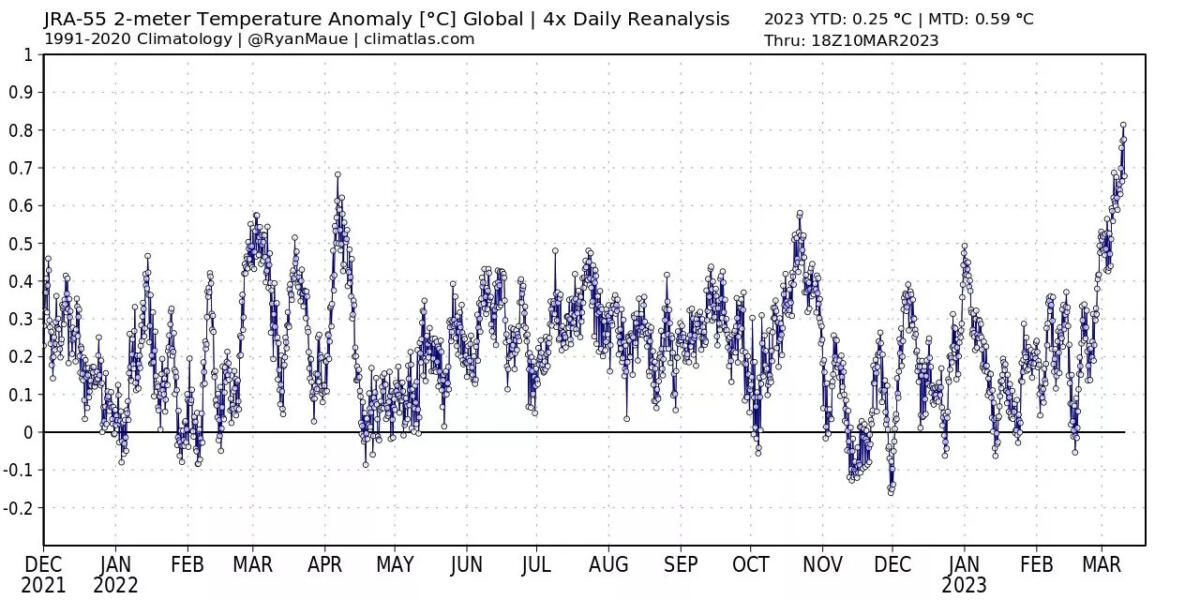 O aquecimento que se observa neste mês de março no mundo só encontra paralelo nos últimos anos em breve período no ano de 2020 e está próximo, apesar de ainda abaixo, dos níveis de 2016, quando um evento de Super El Niño trouxe as maiores médias de temperatura global desde o começo dos registros. O fenômeno El Niño tem como efeito aquecer o planeta.