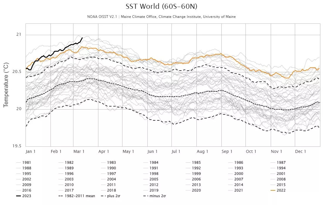 A temperatura média global dos oceanos entre 60ºN e 60ºS neste momento está mais alta para março do que em 2016, quando do Super El Niño, o que é espantoso porque recém se saiu de um La Niña e ainda não há um El Niño configurado.