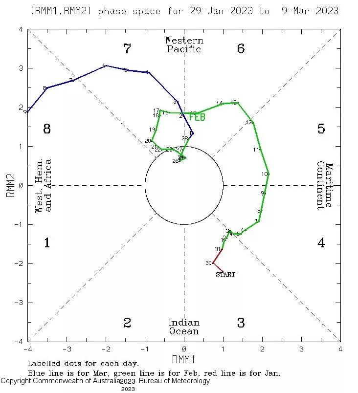 Os dados mostram que a OMJ saiu da escala neste mês em sua fase 8 sobre o Hemisfério Ocidental, o que está gerando um rápido aquecimento das águas do Pacífico Equatorial perto da América do Sul e pode estar “disparando o gatilho” para a formação de um evento de El Niño neste outono. A amplitude da OMJ pode ser a maior neste momento desde o começo dos registros em 1974.