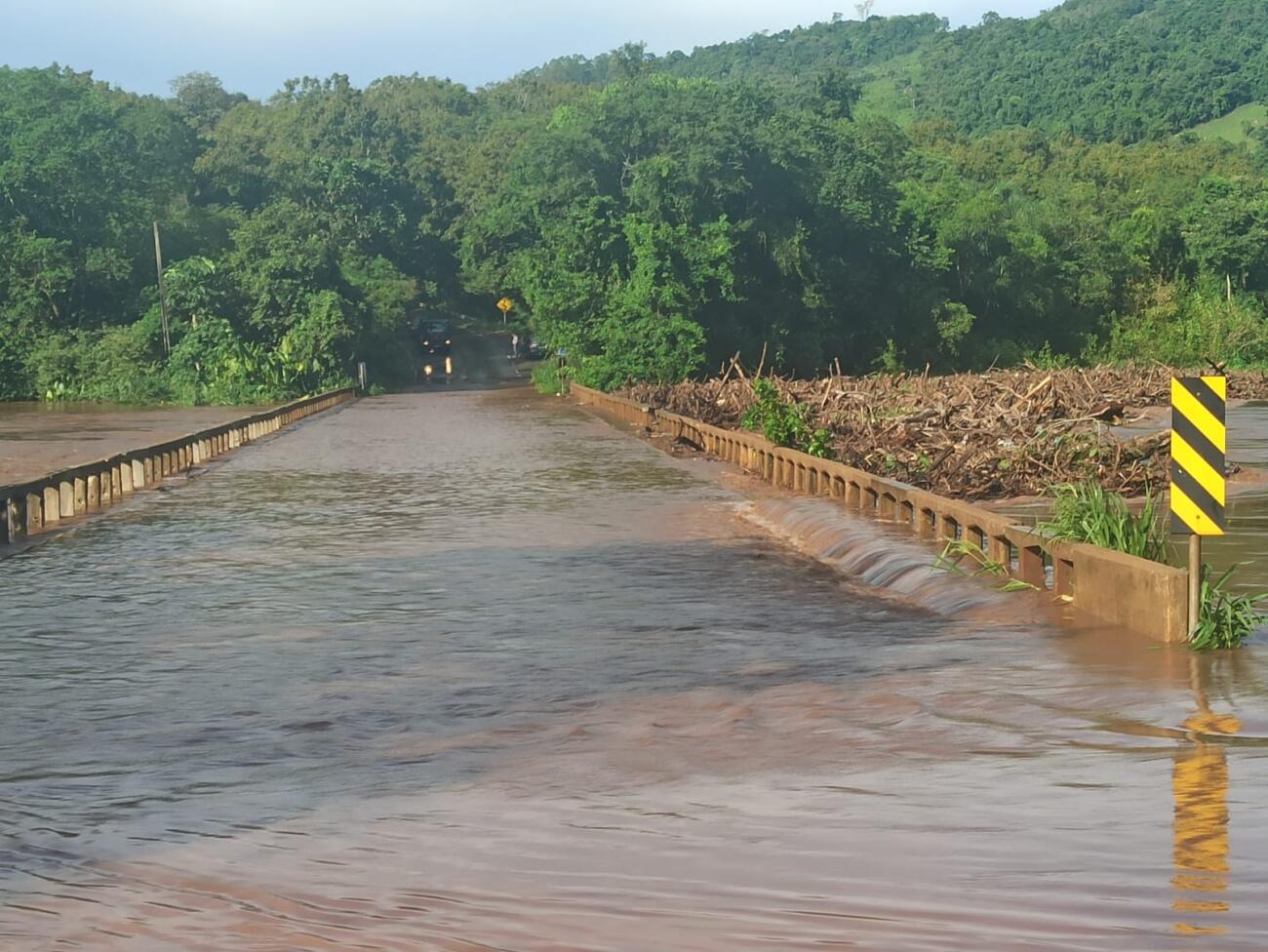 A chuva intensa que atingiu muitas cidades do Sul do Brasil causou transtornos. A rodovia SC-161 foi interditada para a passagem de veículos após um rio transbordar na tarde desta quinta-feira (24). O trânsito está bloqueado na divisa entre os municípios de Flor do Sertão e Romelândia, no extremo Oeste de Santa Catarina.