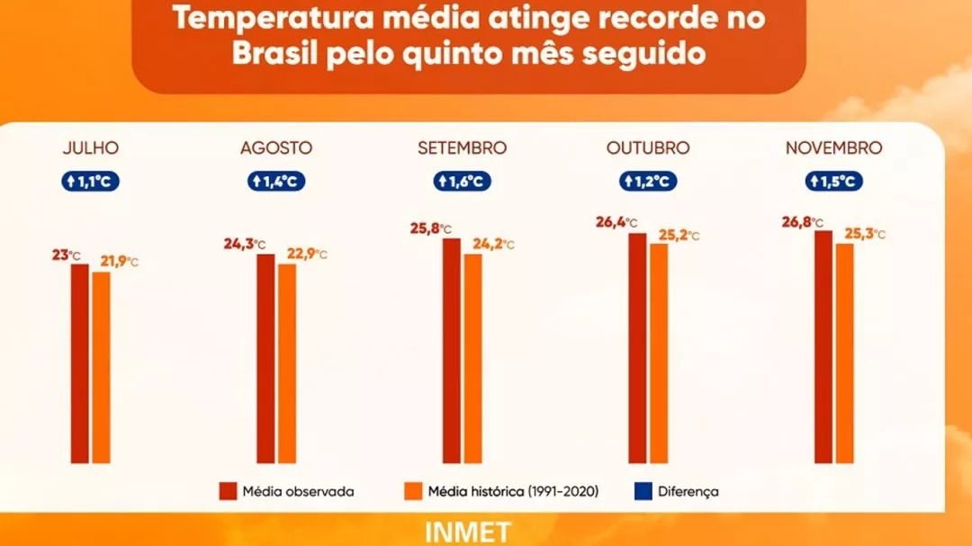 Levantamento do Instituto Nacional de Meteorologia mostra que o Brasil tem recordes mensais de temperatura média nacional por cinco meses seguidos. Julho, agosto, setembro, outubro e novembro tiveram as temperaturas médias mais altas no país já observadas. O maior desvio ocorreu em setembro com +1,6ºC e o segundo mais alto em novembro com +1,5ºC.