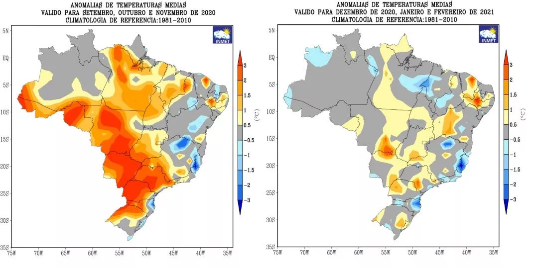 Um exemplo de análogo histórico de como é equivocado o raciocínio linear de que uma primavera muito quente leva necessariamente um verão ainda mais quente é o do período 2020-2021. O trimestre de setembro a novembro de 2020 (primavera) foi de temperatura muito acima da média no Centro-Oeste e no Sudeste com uma poderosa onda de calor, mas o trimestre de verão na sequência (dezembro de 2020 a fevereiro de 2021) não repetiu a tendência.