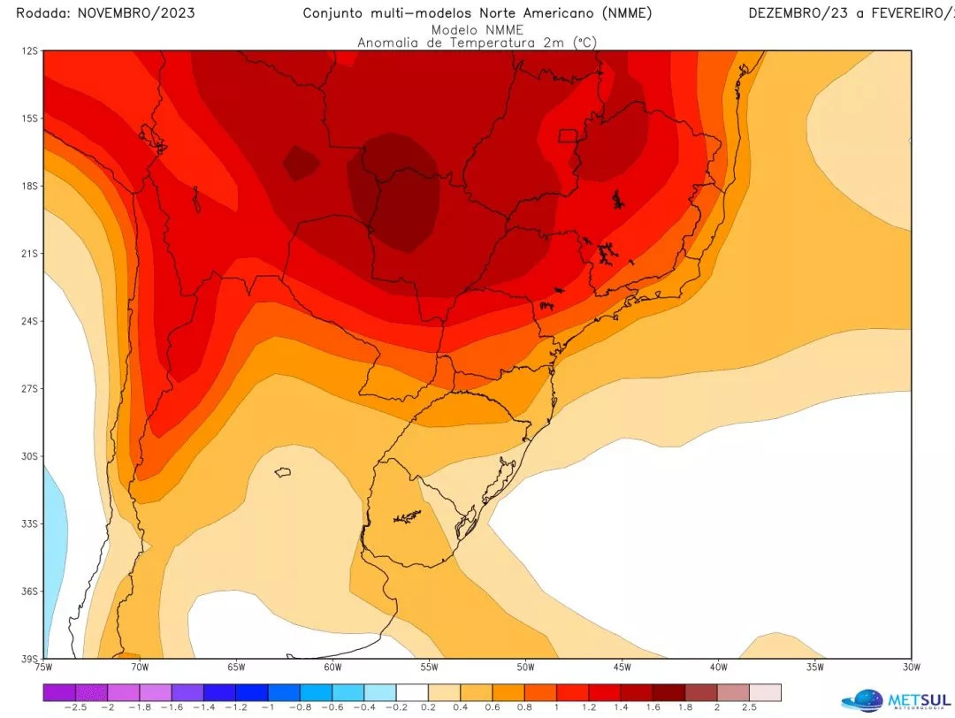 A previsão da MetSul Meteorologia indica um verão de temperatura acima a muito acima da média na maior parte do Brasil em 2024. Com menos chuva do que o habitual, o Centro do país e áreas do Norte e do Nordeste podem anotar temperaturas mais altas ou muito mais elevadas do que o habitual, mas não necessariamente tão extremas como desta primavera em áreas como o Centro-Oeste, interior de São Paulo e Minas Gerais.