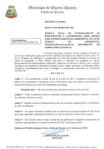 Considerando que além das medidas tendentes à proteção da saúde da população, o Poder Público do Município de Quatro Pontes não pode se distanciar da prudência no regular funcionamento dos estabelecimentos industriais, comercias e de serviços, a fim de evitar o colapso econômico da sociedade, sempre buscando a mobilização pública visando o acautelamento para evitar o contágio e a transmissão comunitária da Covid-19, o decreto nº 030/2021 foi publicado na quarta-feira (31), no Diário Oficial, com novas medidas de funcionamento para restaurantes e lanchonetes.