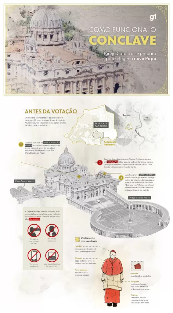 O processo de escolha é longo e cercado de sigilo. A maioria dos 252 cardeais do mundo está a caminho de Roma para participar. Apenas os que têm menos de 80 anos — cerca de 135 — poderão entrar no conclave que elegerá o novo pontífice.