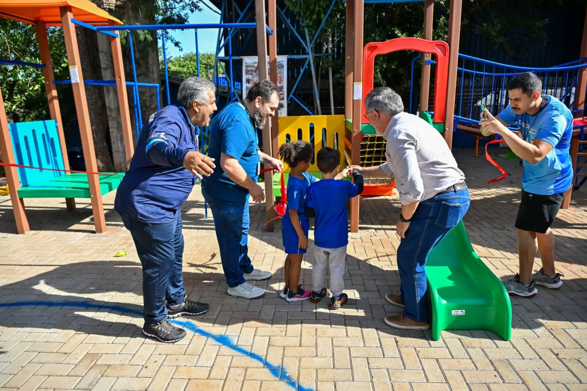 Na manhã de quarta-feira (18), foi inaugurado pelo Projeto Um Chute Para o Futuro um parque infantil, que se somará a outros ambientes lúdicos do projeto, beneficiando as 500 crianças matriculadas. O recurso utilizado para compra dos brinquedos vem da premiação recebida na Gincana Criança Amiga da Saúde, realizada no ano passado em Foz do Iguaçu pela Itaipu Binacional, GT Saúde e Hospital Itamed, com foco em ações de combate ao mosquito da dengue.