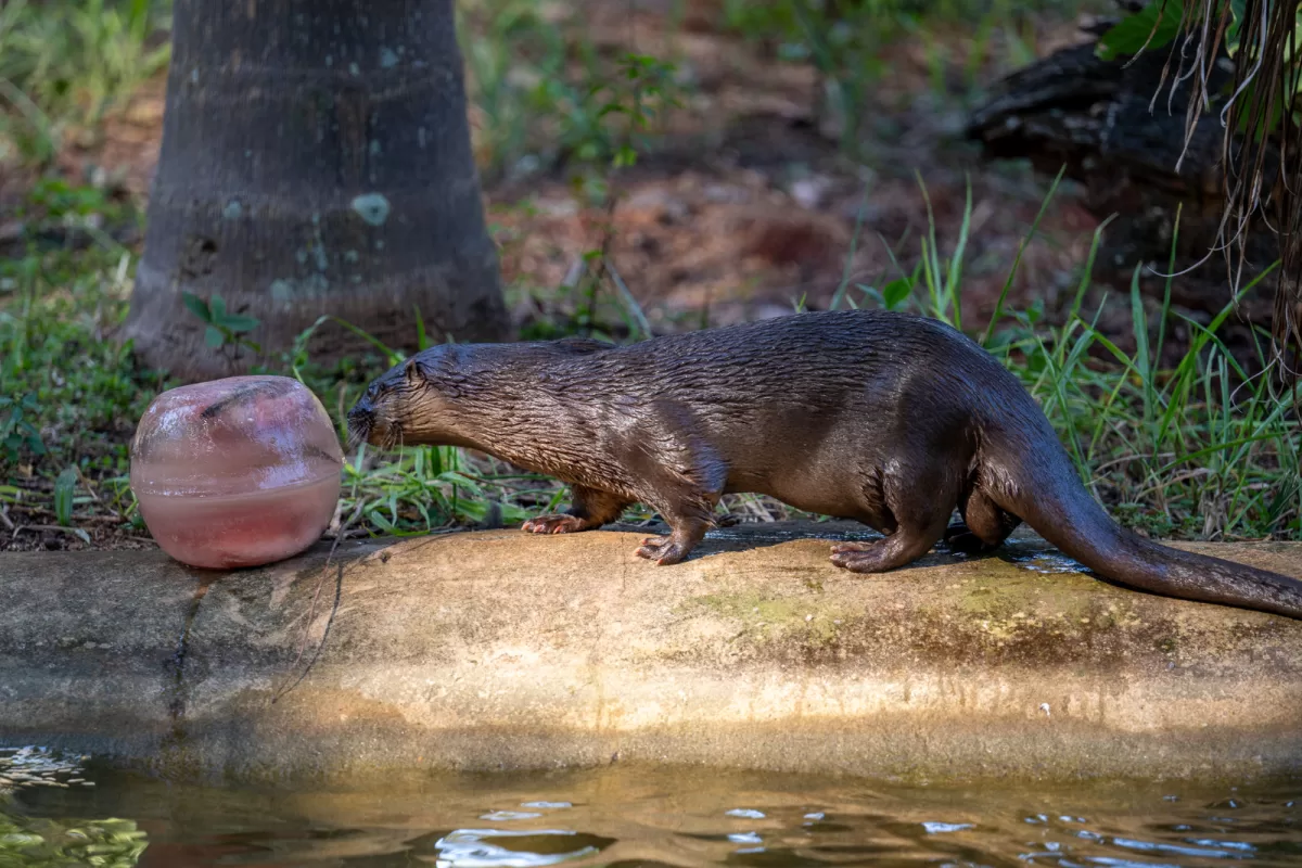 Além da programação voltada aos “jardineiros das florestas”, o Refúgio também promoveu uma atividade especial para a lontra, em celebração ao Dia Mundial da Água. O animal recebeu um cubo de gelo com peixes dentro e aproveitou um refrescante banho de mangueira.