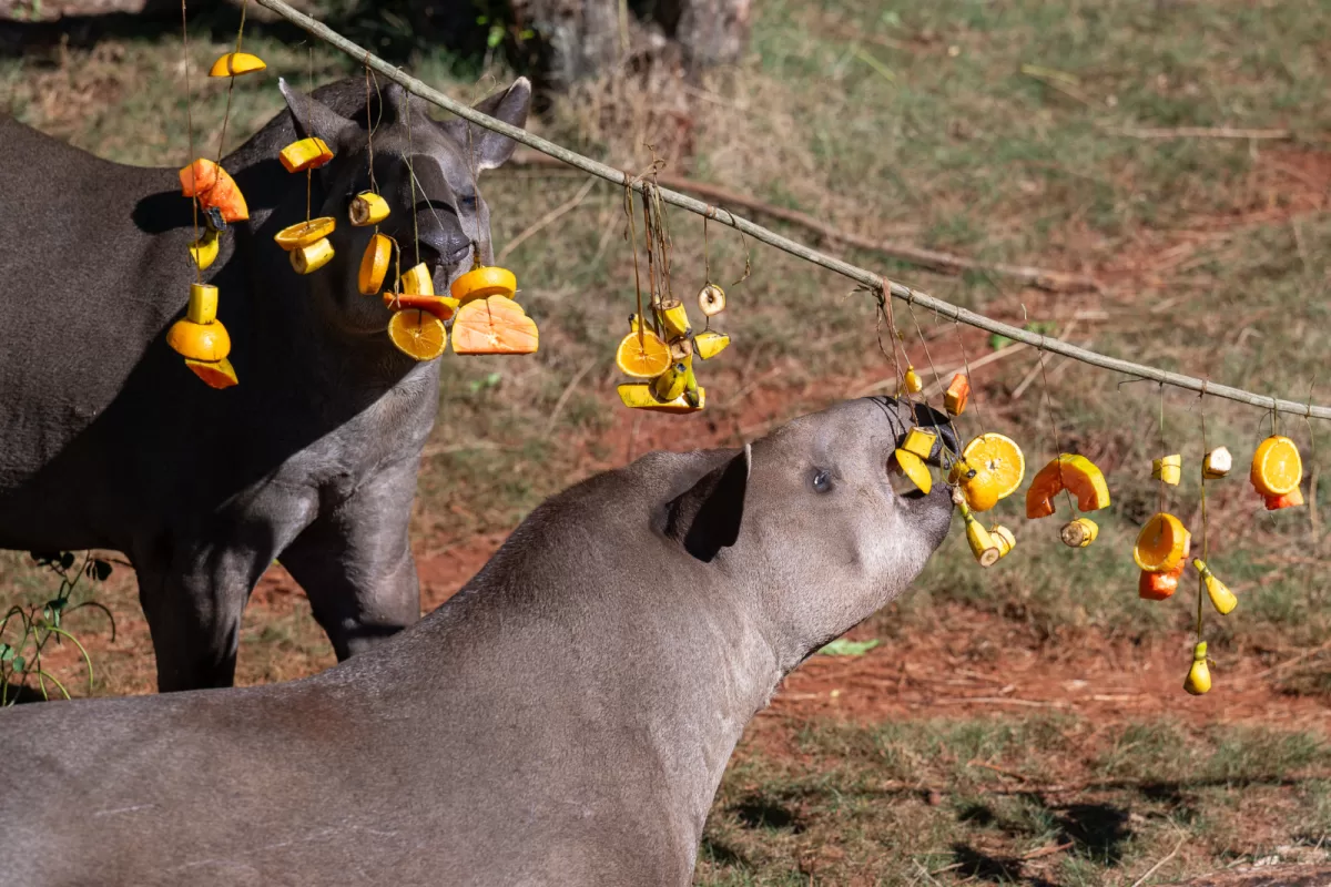 As jacutingas saborearam bananas e mamões em uma pequena árvore montada para estimular seu comportamento alimentar natural. Já as cutias receberam trouxinhas de almeirão recheadas com castanhas-do-Pará e amêndoas. As antas, por sua vez, foram estimuladas com um varal de frutas, simulando situações semelhantes às que encontrariam na natureza.