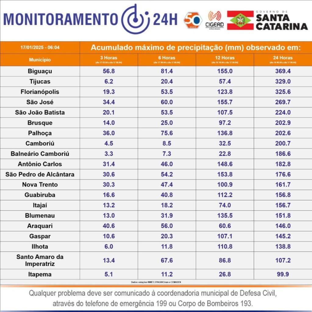 Os acumulados registrados ultrapassaram os 300 milímetros em diversos municípios das regiões do Médio e Baixo Vale do Itajaí e na Grande Florianópolis na quinta-feira (16) e na madrugada desta sexta-feira (17).