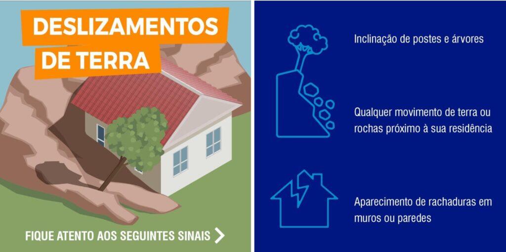 É fundamental que a população esteja atenta a sinais de movimentação de solo, como trincas em paredes e muros, orientação de postes e árvores, estes nas encostas, e desníveis em terrenos, nesses casos, é recomendado buscar um local seguro. Dessa forma, caso esteja em área que não apresente risco a deslizamentos, se possível, permanecer abrigados e longe de áreas com risco.