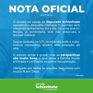 O quadro de saúde do deputado federal José Carlos Schiavinato (PP) apresentou pequena melhora nesta sexta-feira (26), de acordo com nota da família encaminhada pela assessoria. O parlamentar toledano está internado no Hospital Sírio-Libanês, em Brasília, para tratar da Covid-19 desde o dia 03 de março.