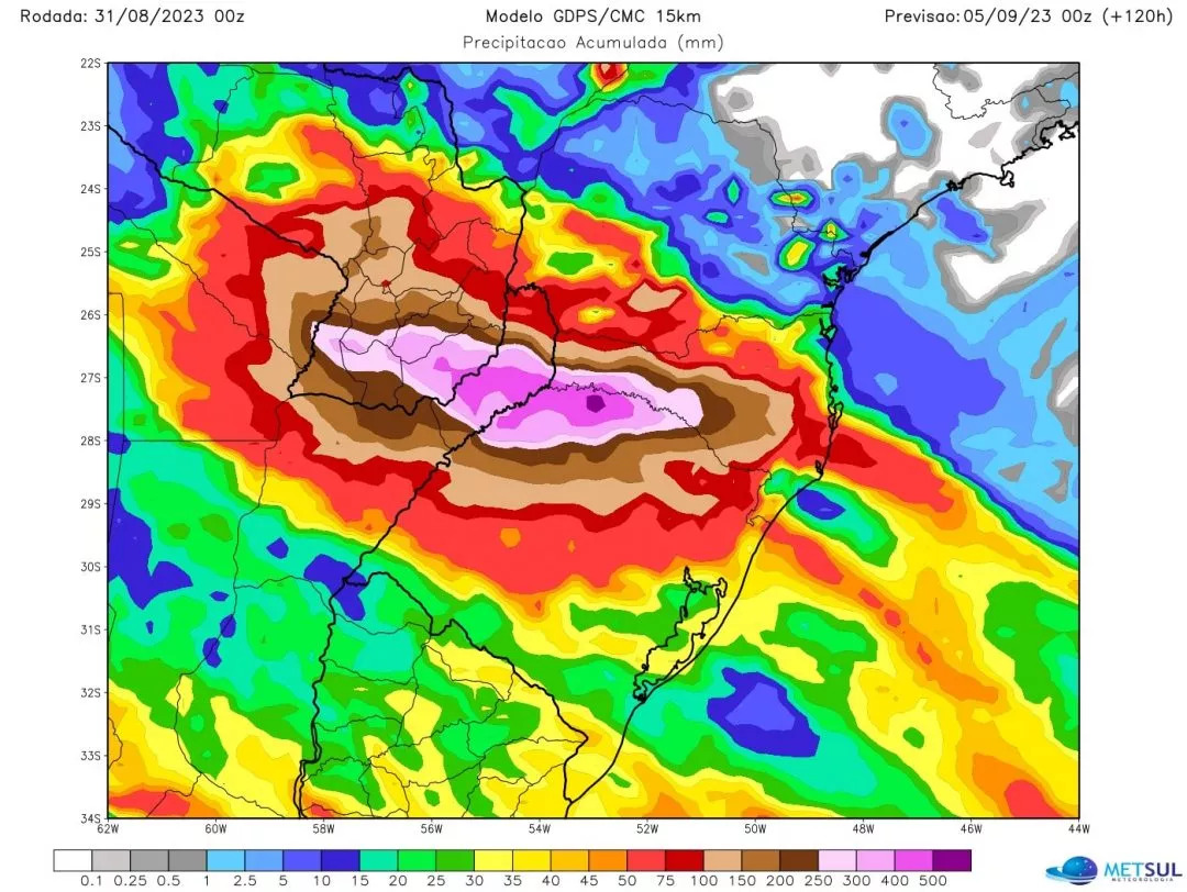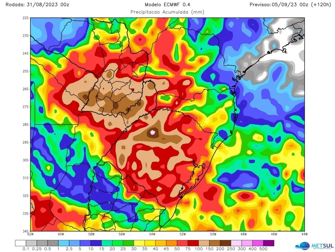 O prognóstico da MetSul, com base nestes modelos e outras simulações computadorizadas que são utilizadas pela empresa, indica chuva acima de 100 milímetros em várias regiões do Rio Grande do Sul entre esta sexta-feira (1º) e o final da segunda-feira (4) com marcas de 200 milímetros a 300 milímetros em algumas áreas e isoladamente superiores (mais de 300 milímetros). A região que deve concentrar os mais altos acumulados de precipitação se concentra do Centro para o Norte gaúcho, sobretudo a Metade Norte.