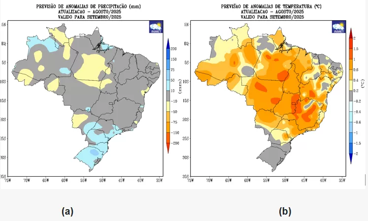 Na Região Norte, o prognóstico climático do INMET para setembro de 2025 indica elevação das temperaturas do ar em grande parte da região, com totais de chuva próximos à normalidade. Sob estas condições, os maiores impactos recaem sobre as culturas permanentes como cacau, açaí e a fruticultura tropical, além das pastagens. Ressalta-se maior vulnerabilidade no sudoeste do Pará, Roraima e Acre, onde a reposição hídrica tende a ser limitada. Essas condições propiciam o estresse hídrico que pode resultar em perda de produtividade e redução da disponibilidade de alimento ao rebanho.
