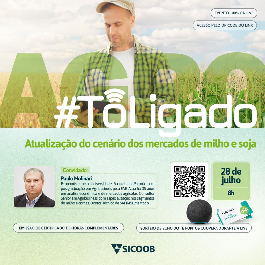 Tendo como público-alvo cooperados, produtores rurais e a comunidade em geral, o Sicoob promove no próximo dia 28, às 8 horas, uma palestra on-line e gratuita com o economista e consultor sênior em agribusiness Paulo Molinari. Ele vai falar sobre o cenário atual e futuro do milho e da soja.