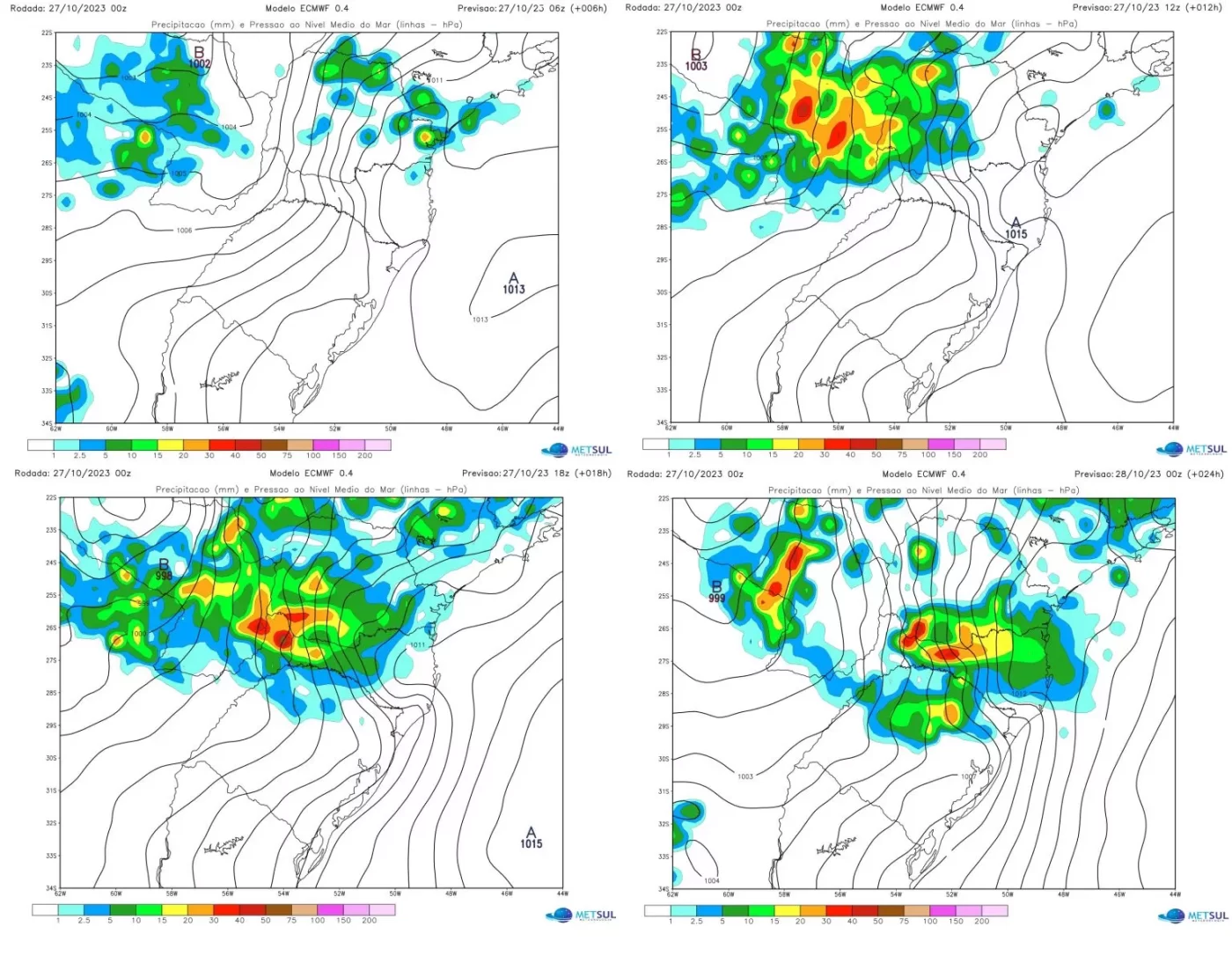 A instabilidade tende a aumentar muito mais neste sábado no Sul do país com chuva muito intensa em diversas cidades, com acumulados de 100 mm a 200 mm em apenas 24 horas com inundações repentinas, e ainda tempestades de granizo com risco de vendavais isolados. Os mapas abaixo mostram as projeções de chuva para a madrugada, manhã, tarde e noite deste sábado pelo modelo europeu.