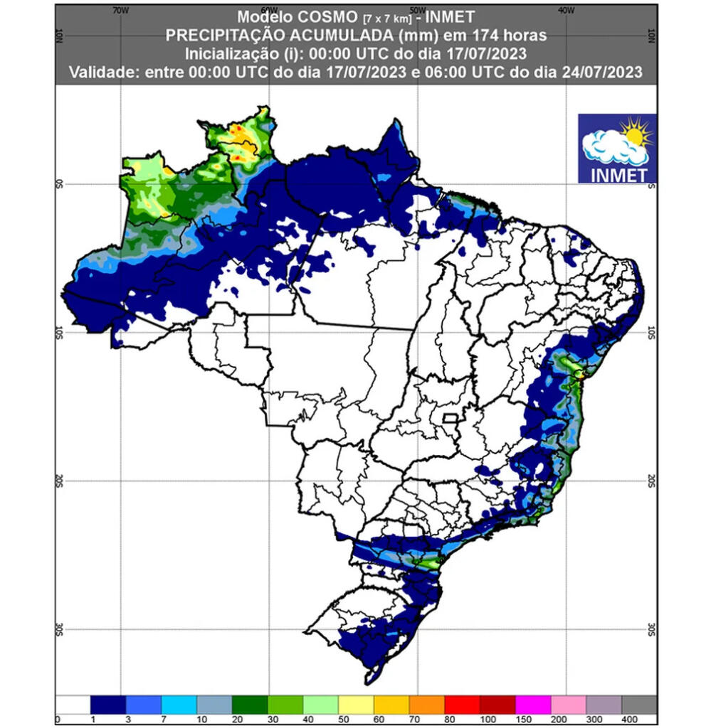No Sul, até pelo menos a próxima segunda-feira (24), a previsão é de chuva em áreas de Santa Catarina e do Paraná, segundo o Inmet. Nessas regiões, os acumulados devem ser menores que 40 milímetros.