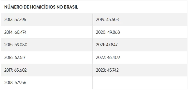 O ano com mais casos foi 2017, com 65.602 homicídios. O menor, 2019, registrou 45.503 mortes. Na comparação com o ano que registrou mais casos, a queda em 2023 é de aproximadamente 30%.