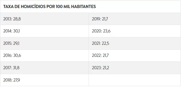 Em 2022, a taxa era 21,7 homicídios por 100 mil habitantes – redução de 2,3% na taxa de um ano para o outro. O pico foi em 2017, quando alcançou 31,8 registros.
