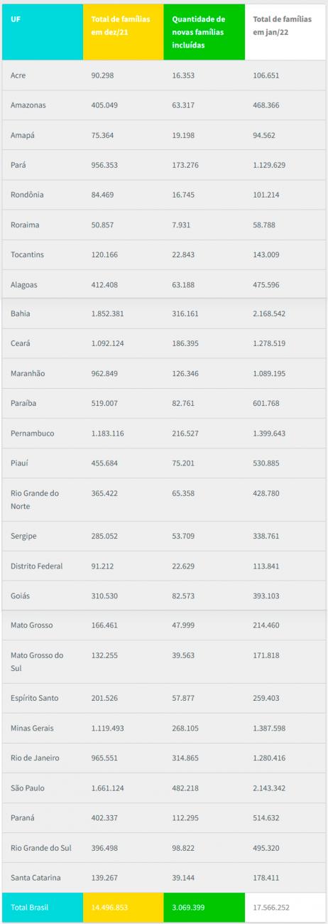 Veja a tabela de inclusão de famílias no Auxílio Brasil em todos os estados e no Distrito Federal: