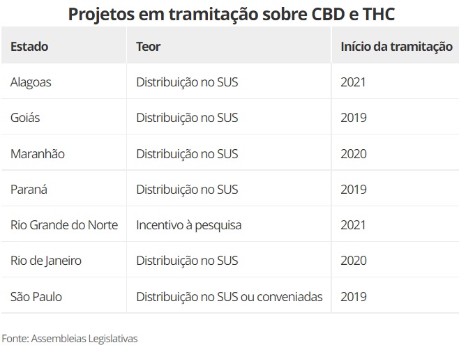 As propostas, em discussão nas assembleias legislativas, se dividem em projetos que pretendem implantar a distribuição dos produtos medicinais via Sistema Único de Saúde (SUS) e, também, incentivar pesquisas sobre o tema.