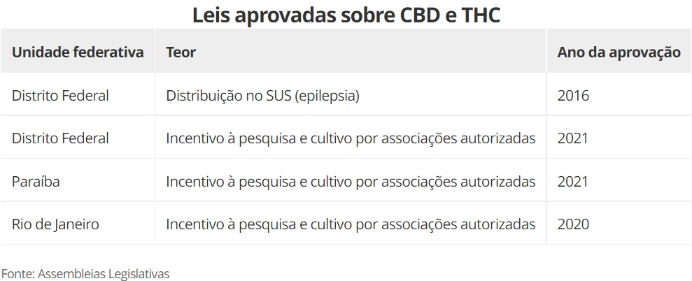 Até janeiro de 2022, o Brasil tem apenas uma lei específica para a distribuição gratuita de produtos medicinais com CBD e THC. Ela foi aprovada em 2016, no Distrito Federal, e é direcionada para pessoas com quadros de epilepsia.