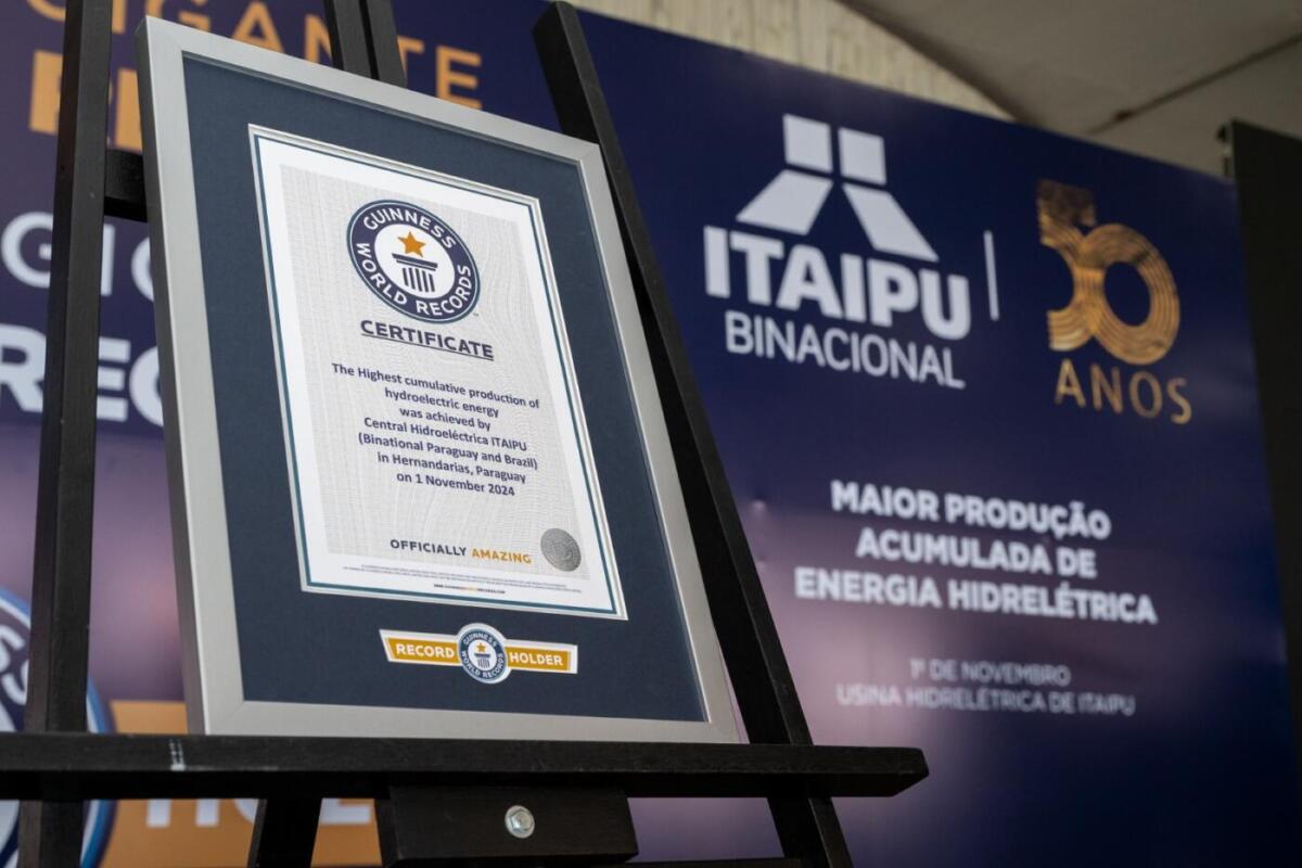 Um pouco antes do aniversário de 40 anos de produção ininterrupta de energia, a hidrelétrica havia atingido, em 10 de março, a marca histórica de 3 bilhões de MWh de energia acumulados desde o início da produção em 1984, consolidando-se como a maior geradora de energia limpa e renovável do planeta. O marco foi reconhecido pelo Guinness World Records, o Livro dos Recordes, que em 1º de novembro deste ano certificou a produção de Itaipu desde maio de 1984 até outubro de 2024 e concedeu à Usina o título de “Maior produção acumulada de energia hidrelétrica”. O anúncio foi feito pela juíza oficial do Guinness, Natalia Ramirez Talero, em cerimônia no hall do Edifício da Produção, localizado sobre a casa de força da usina.