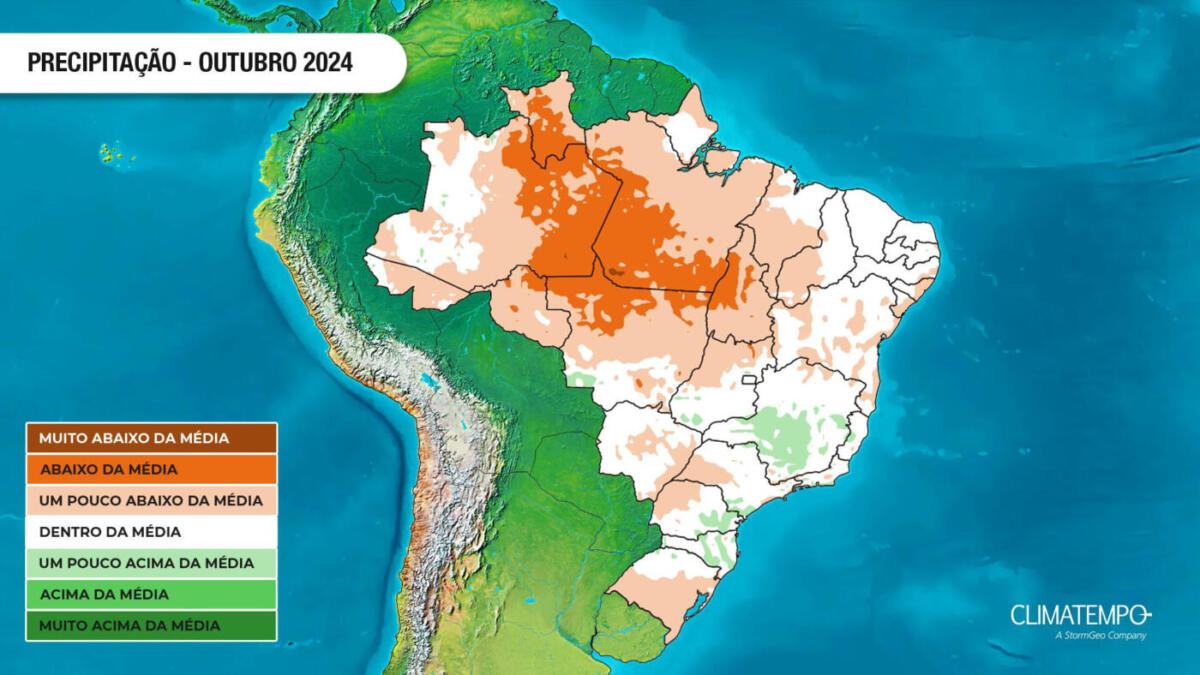 A expectativa para outubro de 2024 aponta para um cenário diferente da média histórica, com chuvas abaixo da média em boa parte do país, principalmente no Norte, Centro-Oeste e Nordeste. Isso contrasta com o padrão típico, sugerindo um mês mais seco e quente, podendo aprofundar secas e ondas de calor, especialmente nas áreas que, pela média, já têm pouca chuva neste período.