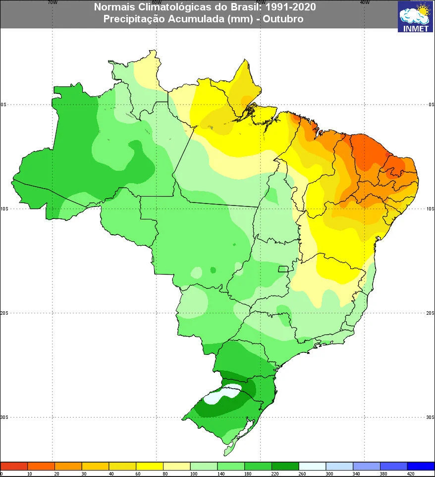 Uma característica importante do clima brasileiro é a distribuição espacial das chuvas, que varia bastante de uma região para outra. O mapa de precipitação acumulada do Brasil para outubro (1991-2020) mostra como essas chuvas costumam se comportar, e isso ajuda a entender a previsão para 2024.
