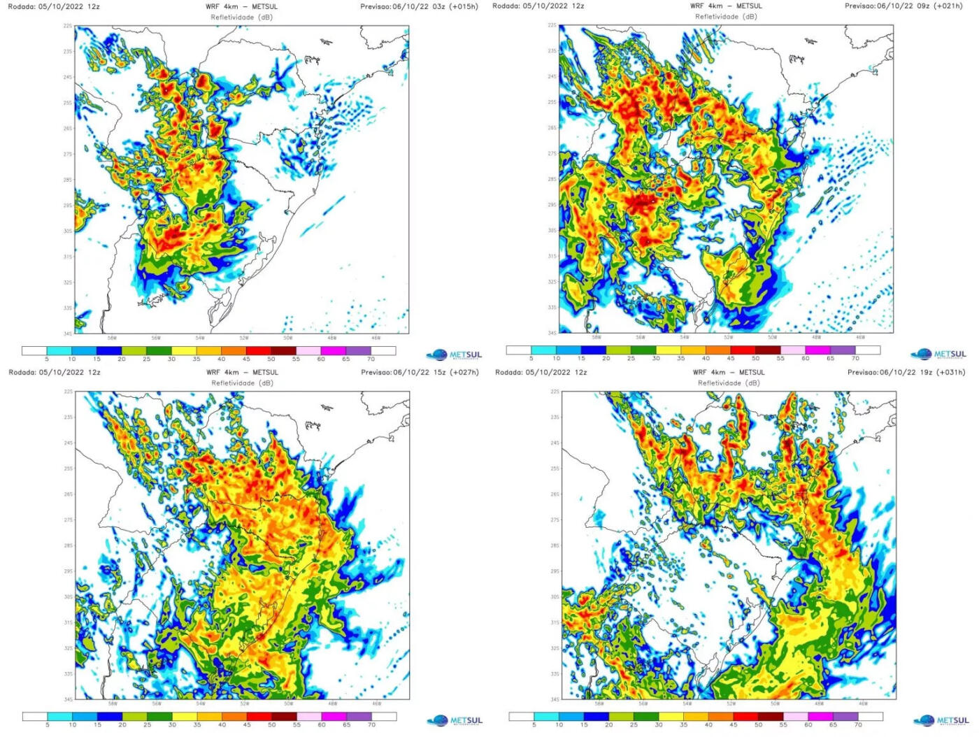 Os temporais ainda trarão chuva muito intensa e com grande número de raios em alguns pontos, o que resultará em acumulados de precipitação muito altos em curto período capazes de causar alagamentos e inundações repentinas. São possíveis volumes de 30 mm a 50 mm em apenas uma ou duas horas em alguns municípios.