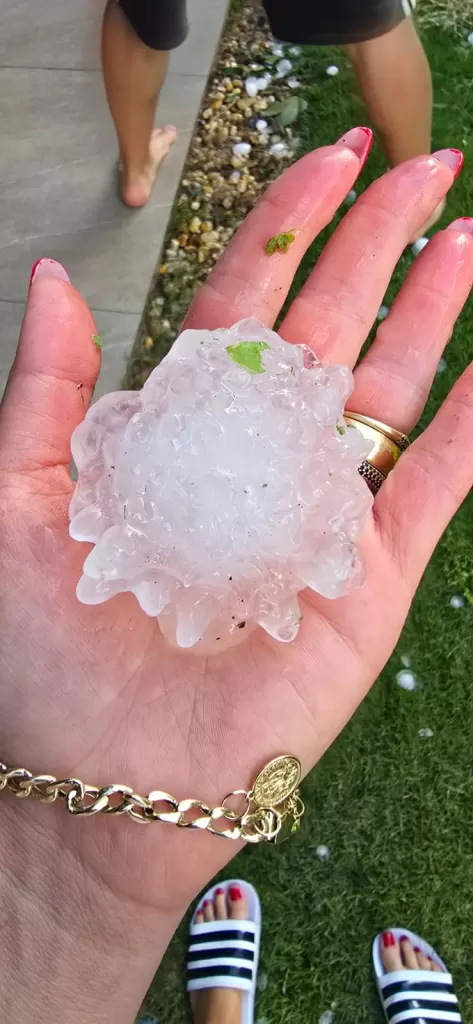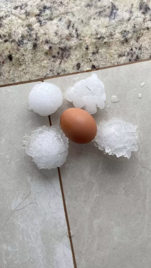 O tamanho das pedras chama atenção. Em duas das imagens, uma pessoa segura um granizo grande na mão, com forma irregular, semelhante ao tamanho de uma pequena maçã.