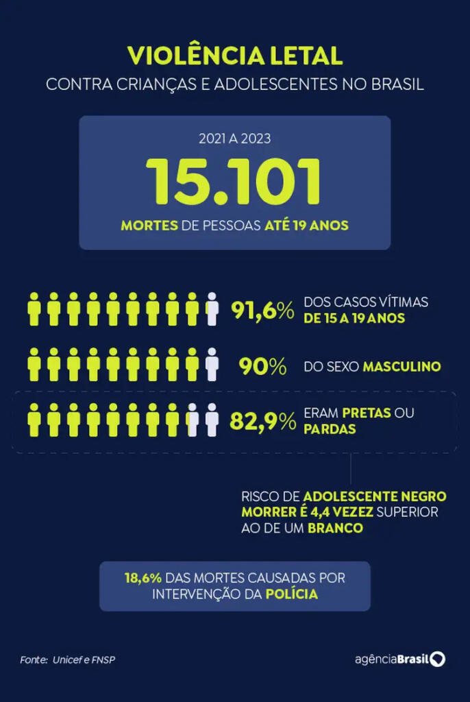 Nos últimos três anos, 91,6% dos casos de mortes por violência letal de crianças e adolescentes englobaram pessoas de 15 a 19 anos; 82,9% eram pretos e pardos; e 90%, homens.