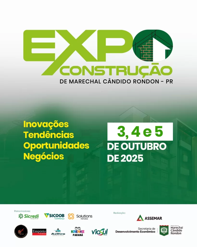A prefeitura de Marechal Cândido Rondon, por meio da Secretaria de Desenvolvimento Econômico e da Associação dos Servidores Municipais (ASSEMAR), está preparando um evento inédito voltado ao setor da construção civil: a 1ª Expo da Construção Marechal 2025, que acontece nos dias três, quatro e cinco de outubro, no centro de eventos, no parque de exposições.