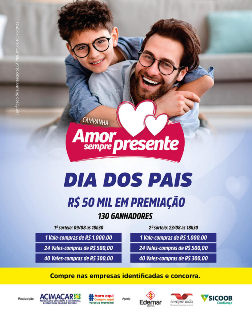 A campanha “Amor Sempre Presente – Dia dos Pais” é promovida pela Acimacar em parceria às empresas do comércio de Marechal Rondon, sendo legalizada pela Secretaria de Acompanhamento Fiscal, Energia e Loterias (Sefel) do Ministério da Fazenda.