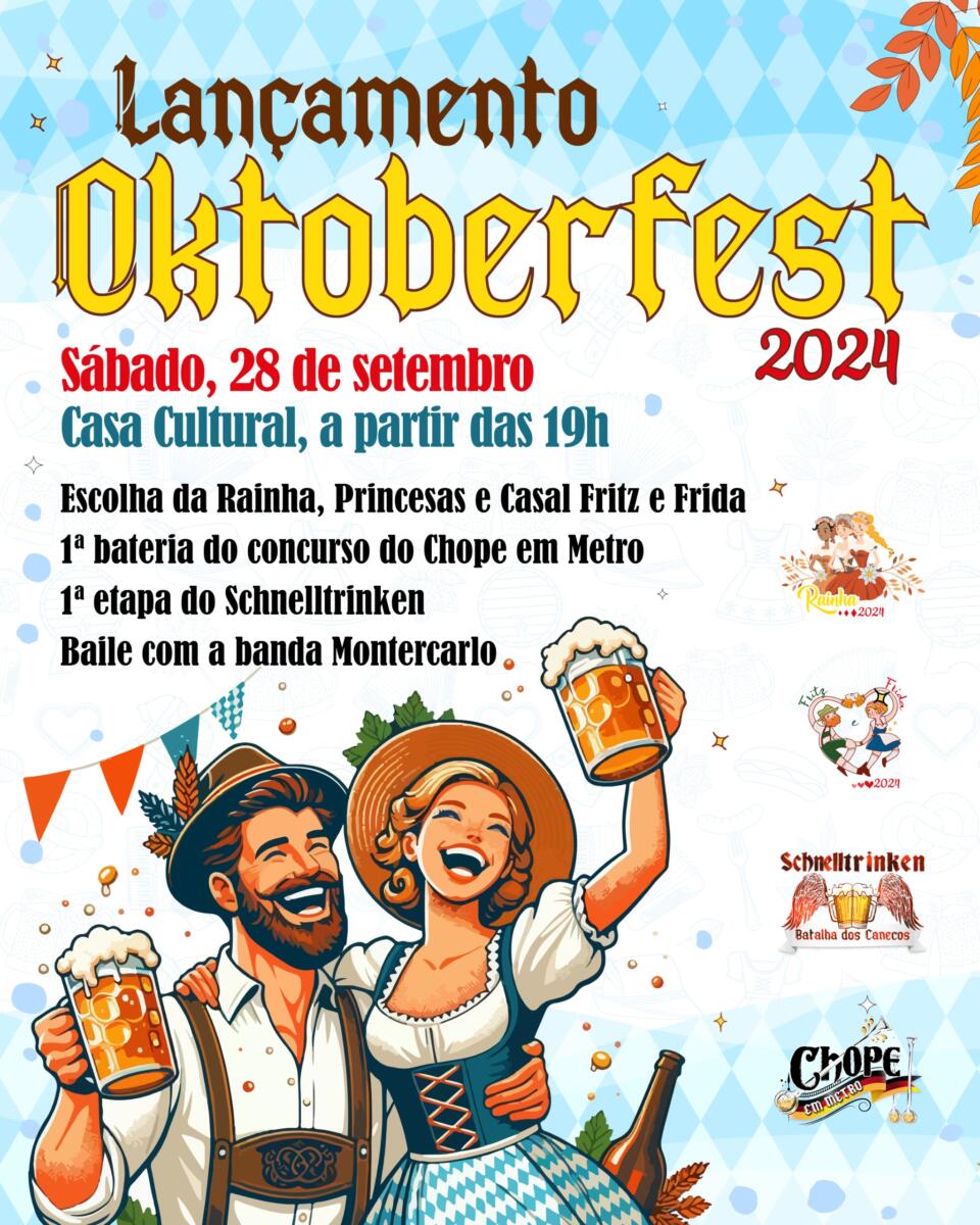 A programação iniciará às 10 horas, com desfile de bierwagen, com banda, e distribuição de chope pelas principais ruas do centro da cidade. À noite, a programação acontecerá na Casa Cultural, quando será realizado o ato oficial de lançamento da Oktoberfest 2024, além do concurso de escolha do Casal Fritz e Frida, que terá a participação de três casais, sendo eles Aldir e Glaci Wundrak, Nilson e Merielen Lunkes e André Deimling e Janaina Helfenstein, também haverá o concurso para a escolha da Rainha e Princesas, cujas candidatas são Milena Gabriela Griep, Natália Vitoria Freitag, Jaqueline Daniela Wundrak, Claudia Briesch, Ana Carolina Bade Zimmermann e Caroline Paschoini, além de apresentações culturais, concursos do Chope em Metro e do Schnelltrinken, e baile com a banda Monte Carlo. A entrada é gratuita.