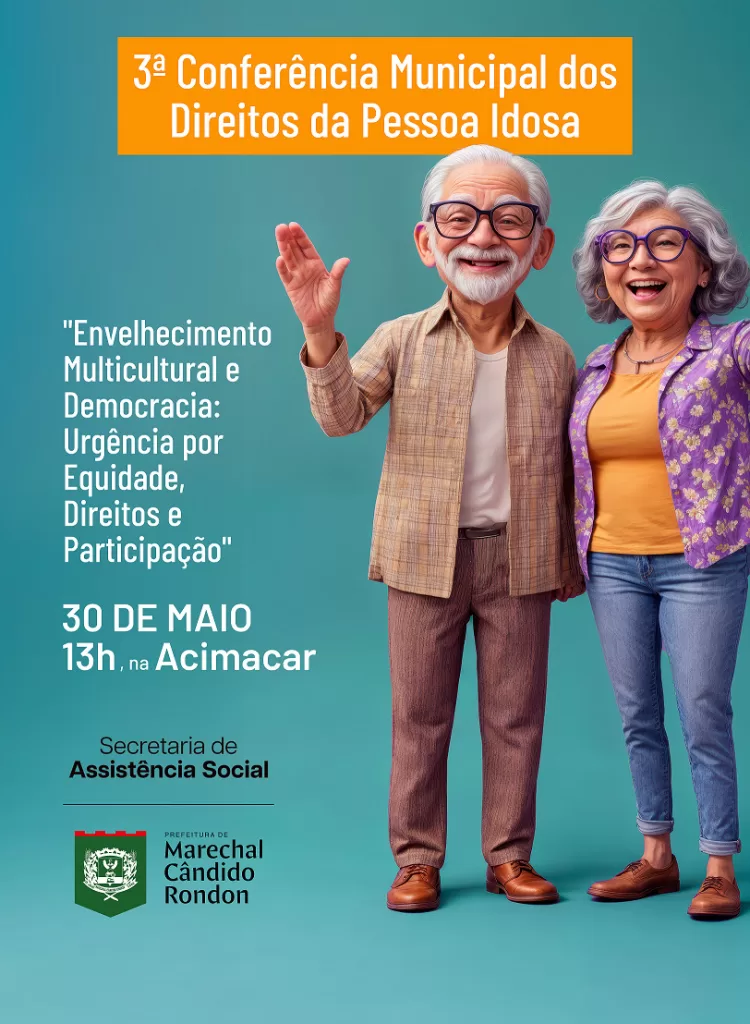 Com o tema “Envelhecimento Multicultural e Democracia: urgência por equidade, direitos e participação”, a prefeitura de Marechal Rondon, por meio da Secretaria de Assistência Social e do Conselho Municipal dos Direitos do Idoso, promove, nesta sexta-feira (30), a 3ª Conferência Municipal dos Direitos da Pessoa Idosa. O encontro será realizado no auditório da Associação Comercial e Empresarial de Marechal Cândido Rondon (Acimacar), a partir das 13 horas. A palestra será ministrada por Leodir José Pasetti, e terá como tema “Diversidade Cultura no Envelhecimento”.