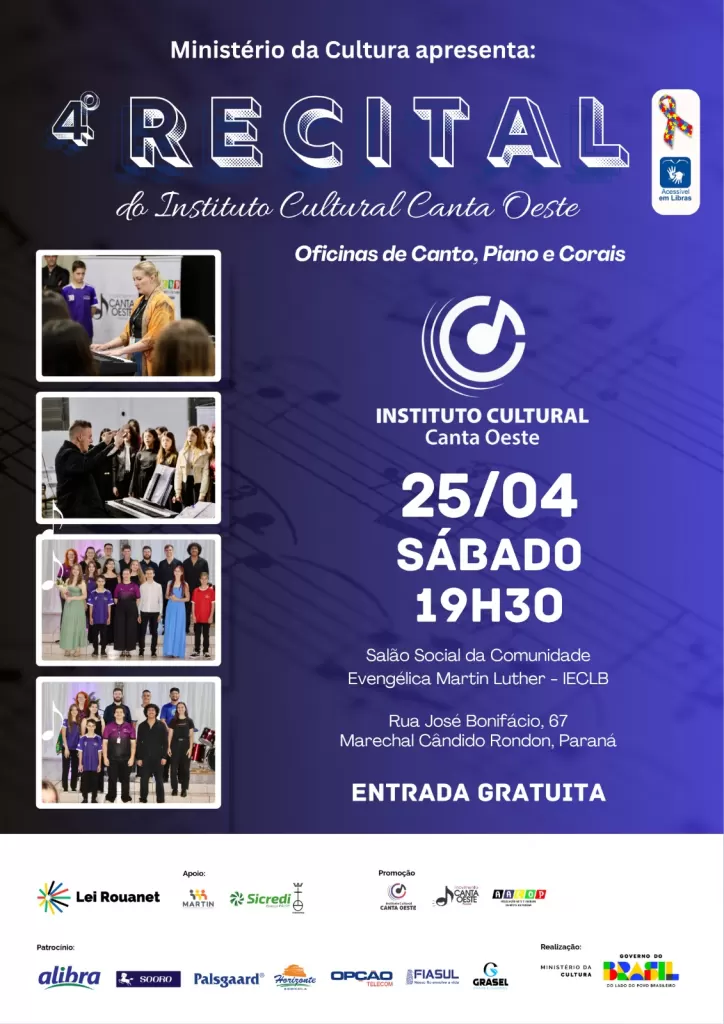 O Instituto Cultural Canta Oeste (ICCO) realiza, no sábado (25), às 19h30, o seu 4º Recital de Oficinas de Canto, Piano e Corais. O evento, que terá como palco o Salão Social da Comunidade Evangélica Martin Luther (IECLB), marca um ciclo de formação artística que reúne jovens e crianças de diversas cidades da região. Com entrada gratuita e acessibilidade em Libras, a apresentação é o resultado prático de meses de dedicação técnica e desenvolvimento humano, consolidando o compromisso da instituição com a democratização da cultura de alto nível.