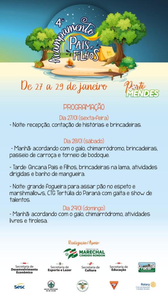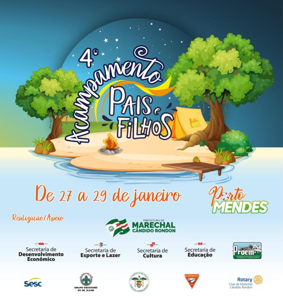 Passada a programação de final de ano, a prefeitura de Marechal Cândido Rondon já inicia a organização de eventos no ano de 2023. Um dos primeiros, será o 4º Acampamento Pais e Filhos, que acontece de 27 a 29 de janeiro, no parque de lazer de Porto Mendes. No ano passado o evento não pode ser realizado devido à pandemia.