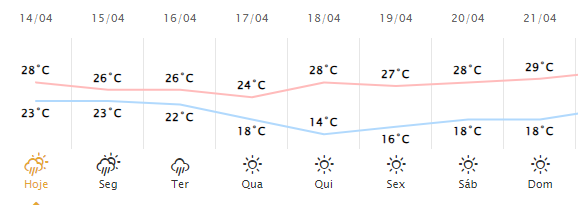 Os dias ensolarados são previstos a partir de quarta-feira (17), com temperaturas máximas não ultrapassando 28ºC. As temperaturas mínimas, por sua vez, chegam a 14ºC na quinta-feira (18).