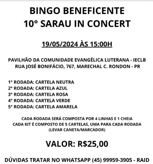 A Associação Arte e Cultura do Oeste do Paraná (AACOP) promove no domingo (19) o 1º Bingo Beneficente em prol do 10º Sarau In Concert. O bingo será no pavilhão da Comunidade Luterana IECLB, situado à Rua José Bonifácio, 747, no centro de Marechal Cândido Rondon, com início previsto para as 15 horas.