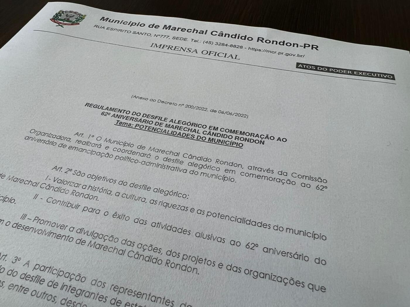 O regulamento foi publicado nesta terça-feira (07) no Diário Oficial Eletrônico do município. O desfile terá como tema “Potencialidades do Município”, e objetiva valorizar a história, a cultura, as riquezas e as potencialidades do município e promover a divulgação das ações, dos projetos e das organizações que fomentam o desenvolvimento de Marechal Rondon. Para isso, estão sendo chamados para participar do evento integrantes de estabelecimentos educacionais, projetos, associações, clubes, empresas, entidades, entre outros, desde que atuem na base territorial do município.
