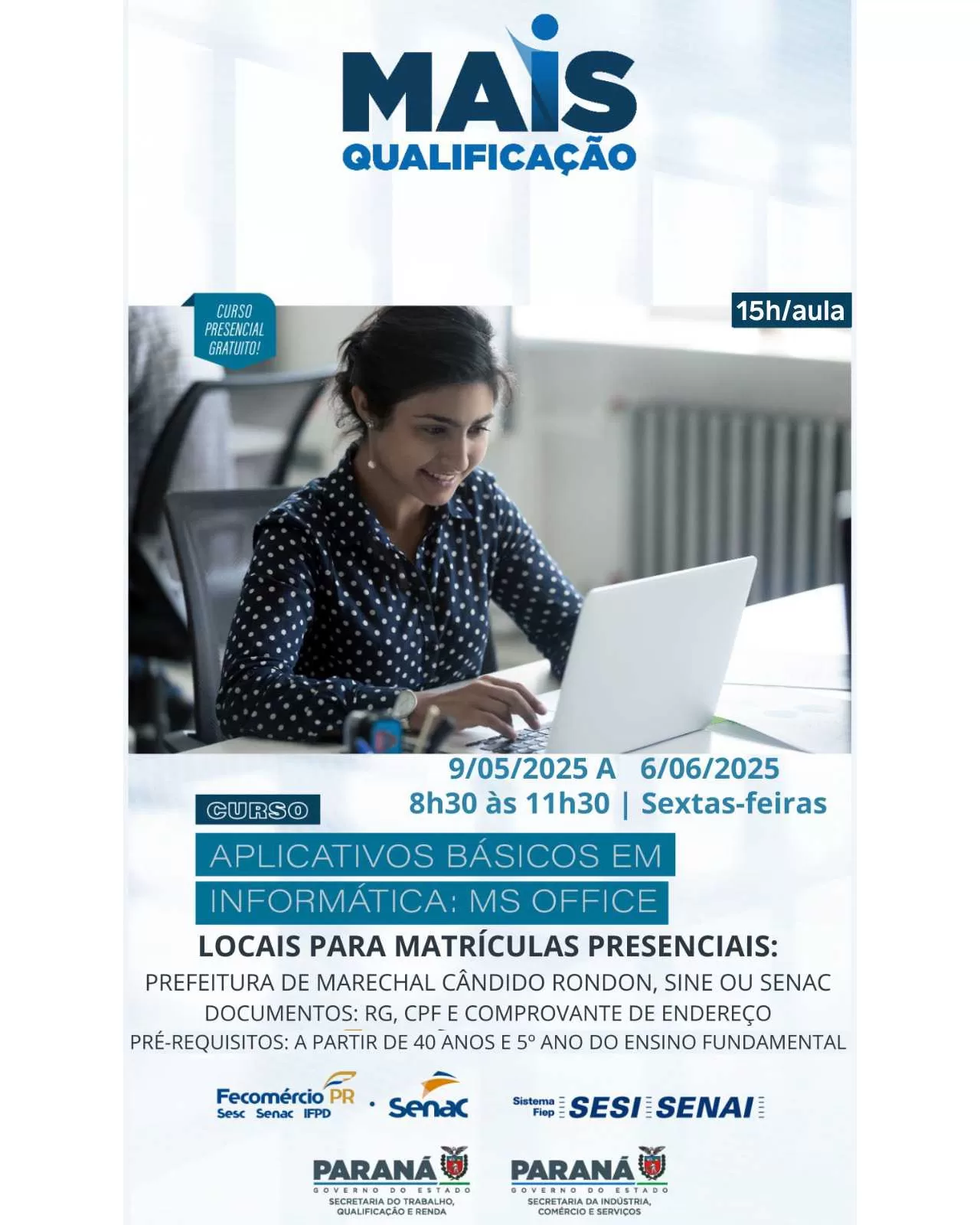 Estão abertas, a partir desta segunda-feira (5), as inscrições para o curso gratuito Aplicativos Básicos em Informática: MS Office. A iniciativa é promovida pelo Governo do Estado, SENAC e SENAI, com o apoio da Prefeitura de Marechal Cândido Rondon, por meio da Secretaria de Desenvolvimento Econômico, através do programa Mais Qualificação.